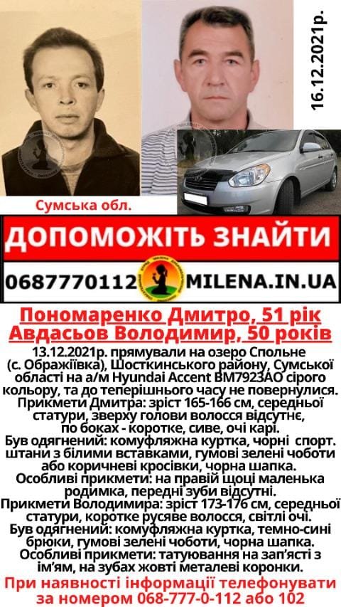 Чоловіки 13 грудня вдень поїхали на автомобілі Hyundai Accent рибалити на озеро Спольне, що в районі села Ображіївка Шосткинського району, і назад не повернулися. Їх мобільні телефони вимкнені 0542.ua »