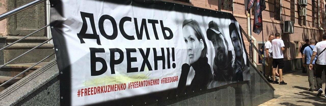 На крыльце суда вывесили баннер «Досить брехати», на котором также изображены портреты Юлии, Андрея и Яны. 0564.ua »