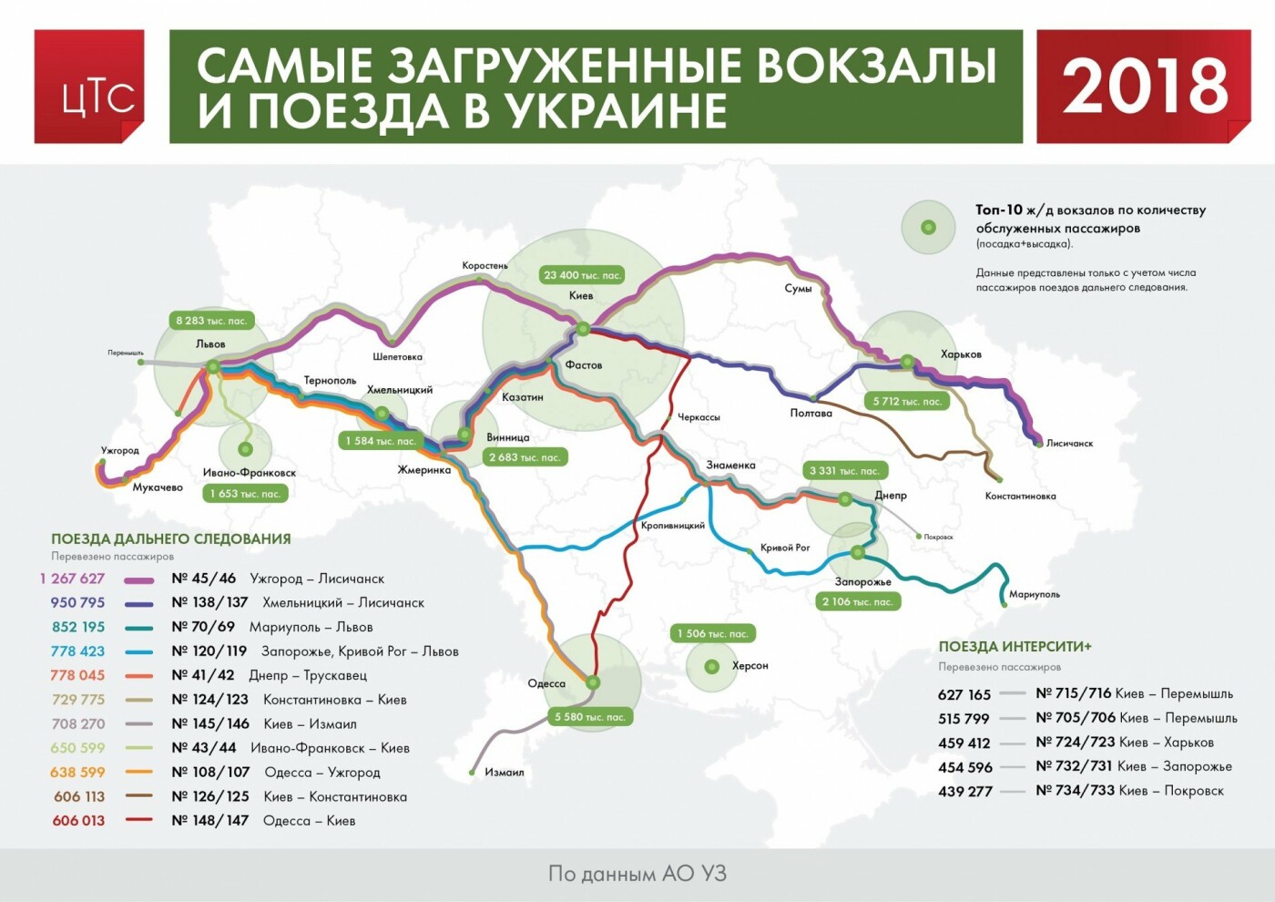 АО "Укрзализныця", которые предоставила данные о самых загруженных поездах и вокзалах Украины по итогам 2018 года. 0564.ua »