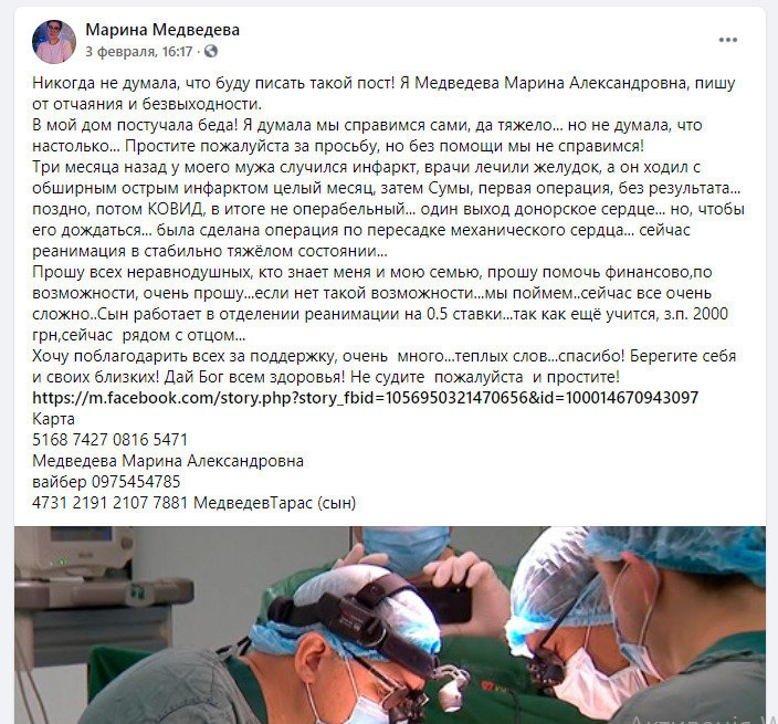 Перерахувати допомогу на лікування Миколі Медведєву можна на карти банку: 5168 7427 0816 5471 Медведєва Марина Олександрівна (дружина) Телефон, Вайбер 0975454785 4731 2191 2107 7881 Медведєв Тарас 0542.ua »