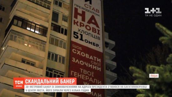 В Луцке промышленные альпинисты срезали баннер с критическим обращением к президенту Петру Порошенко, который был размещен на 16-этажке в центре города вечером 13 марта. Как пишут «Волынские новости», баннер со словами «Ты стал президентом на крови ребят 51 ОМБР. inforesist.org »