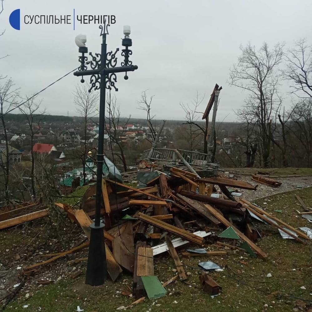 Такий виглядає нині має альтанка на Болдиних горах у Чернігові після російських обстрілів. 0462.ua »
