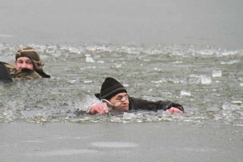 Спасатели при помощи шанцевого инструмента прорубили лед и извлекли тело мужчины, которое находилось возле берега во льду 62.ua »