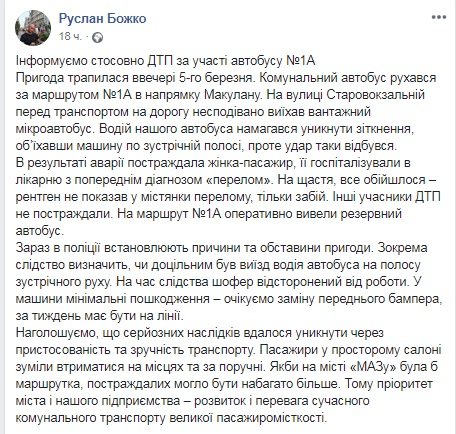Детали ДТП с участием коммунального автобуса и грузовика, произошедшего вечером 5 марта, прокомментировал в соцсети заместитель директора предприятия "Городской троллейбус" Руслан Божко. 0564.ua »