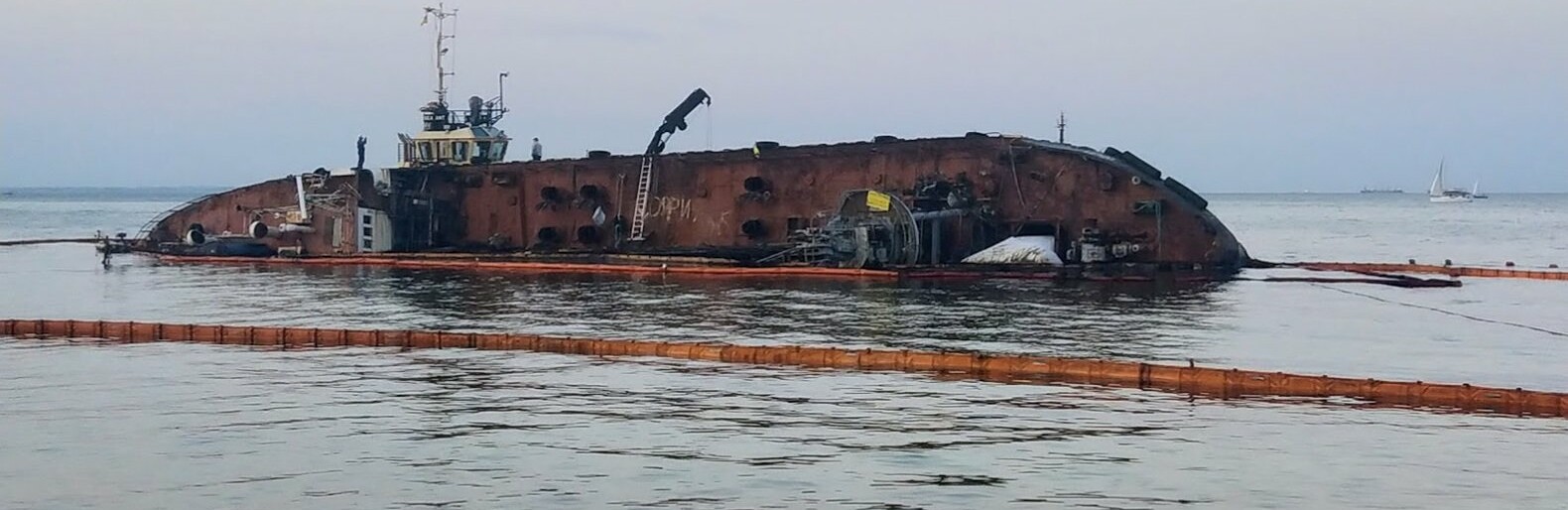 Очередная попытка поднять затонувший танкер на киль провалилась, зато произошел новый излив нефтепродуктов, повлекший загрязнение около 100 квадратных метров поверхности воды. k.img.com.ua »