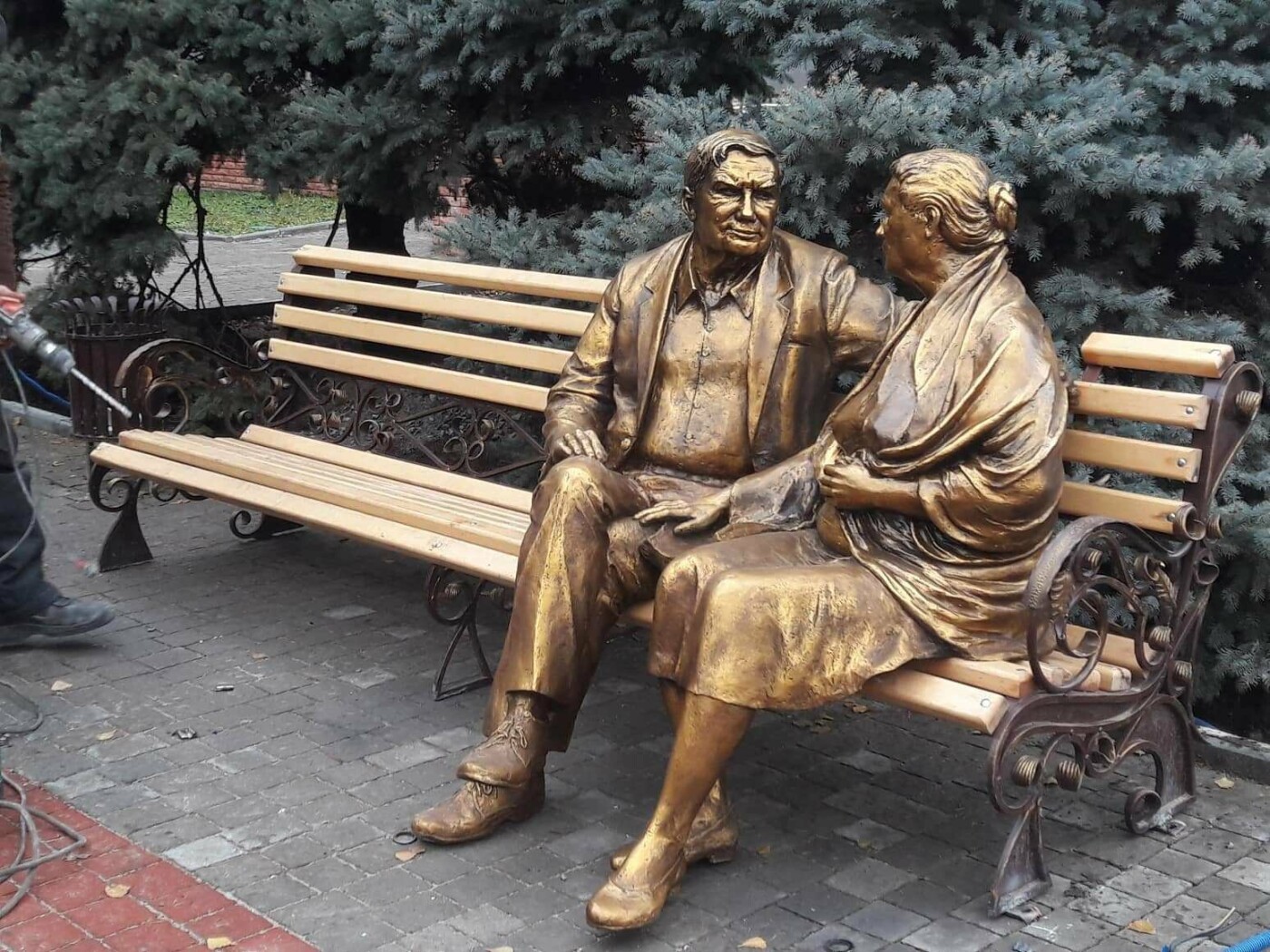 Скульптуру, изображающую двух пожилых людей на лавочке, покрасили "под бронзу" и перенесли на площадь напротив театра Магара. 061.ua »