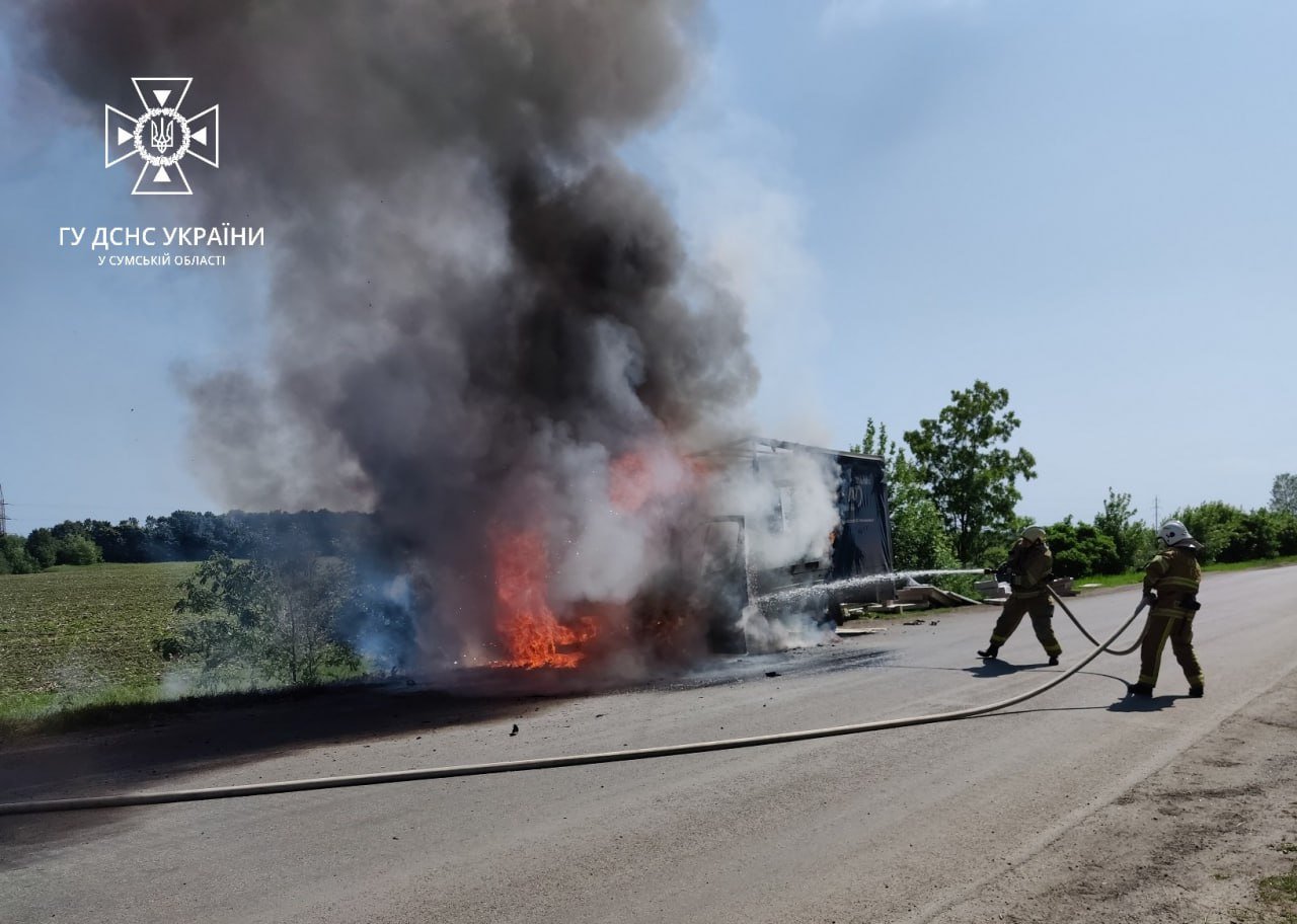 На Сумщині серед дороги загорілась вантажівка, а у полі – трактор