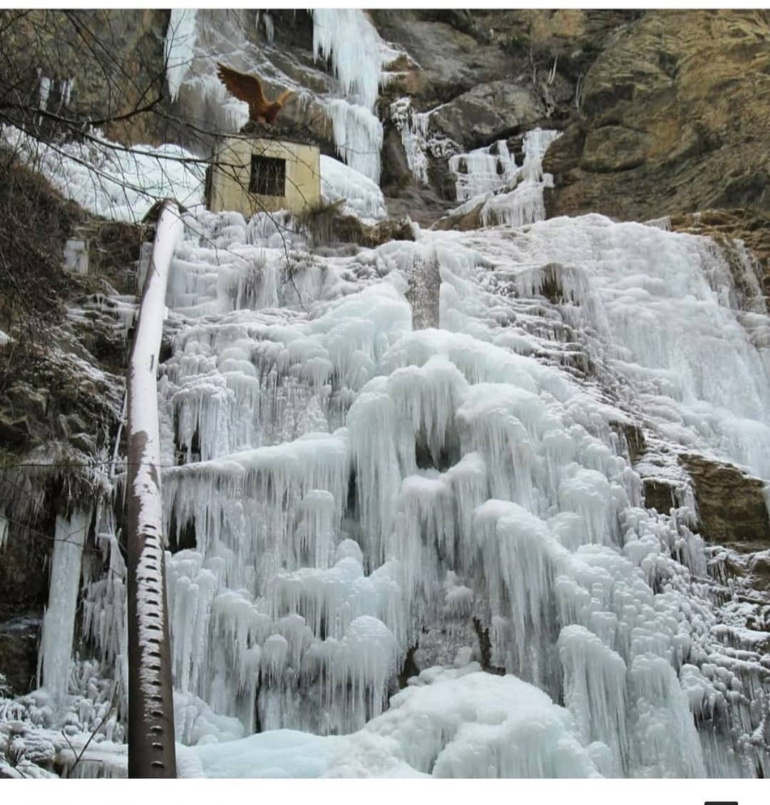Вместо воды на склоне образовались сосульки, а около водопада лежит снег. focus.ua »