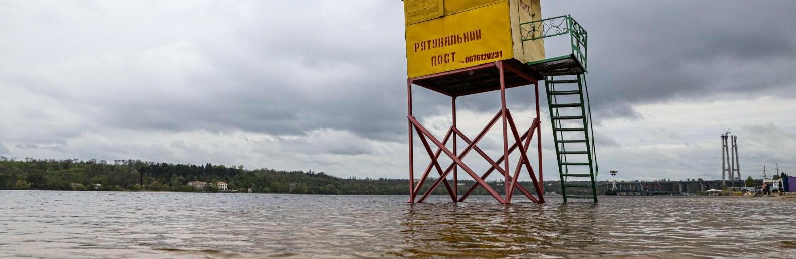 Вода «з’їла» з десяток метрів пляжу, підтопивши рятувальний пост, урни, «грибки» та дерев’яний майданчик кафе. 061.ua »