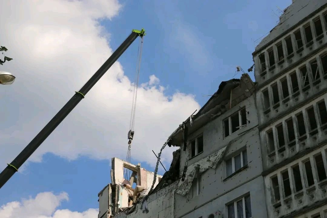 Група верхолазів ДСНС розбирали і скидали донизу нестійкі зруйновані конструкції з верхнього поверху дев’ятиповерхівки, аби запобігти їхній неконтрольованій руйнації і падінню 057.ua »