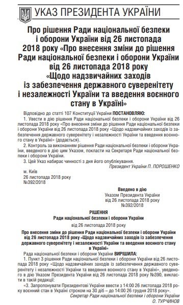Закон о введении в Украине военного положения вступил в силу. Его опубликовали в газете "Урядовый курьер". Документ вводит в действие решение СНБО о введении военного положения до 14-ти часов 26 декабря 2018-го в Винницкой, Луганской, Николаевской, Одесской, Сумской, Харьковской, Черниговской, а также Донецкой, Запорожской, Херсонской областях и внутренних водах Азово-Керченской акватории. gazeta.ua »