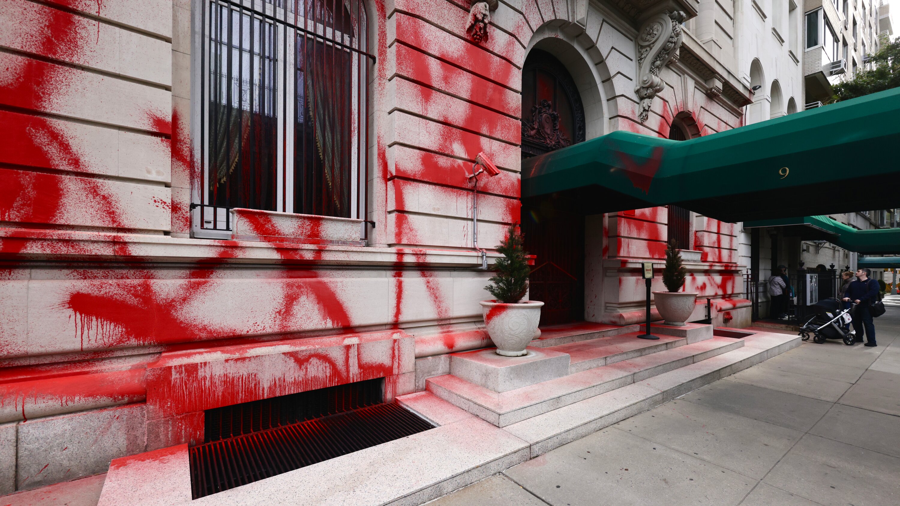 Акцию провели двое неизвестных. Пока один из пульверизатора обливал фасад краской, второй фиксировал происходящее на камеру. focus.ua »