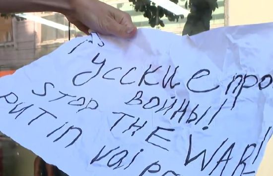 Гражданка РФ на стене российского дипломатического представительства в Рио-де-Жанейро наклеила плакаты "Остановите войну" и "Путин, тебя ждет ад".