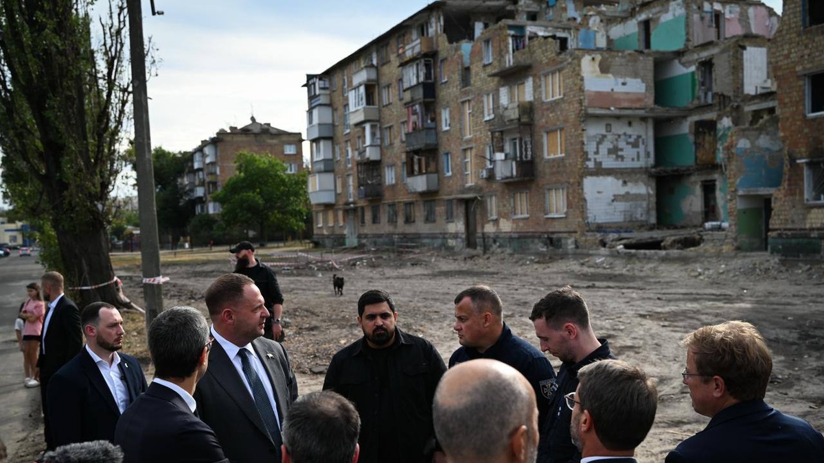 Керівник Київської міської військової адміністрації Тимур Ткаченко разом із керівником Офісу президента України Андрієм Єрмаком та радниками з питань безпеки Німеччини, Британії, Франції та Італії вшанували пам’ять киян, загиблих унаслідок російського обстрілу Дарницького району столиці.