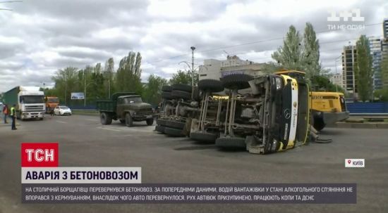Груженая цементом машина перевернулась прямо посреди улицы - водитель был пьян