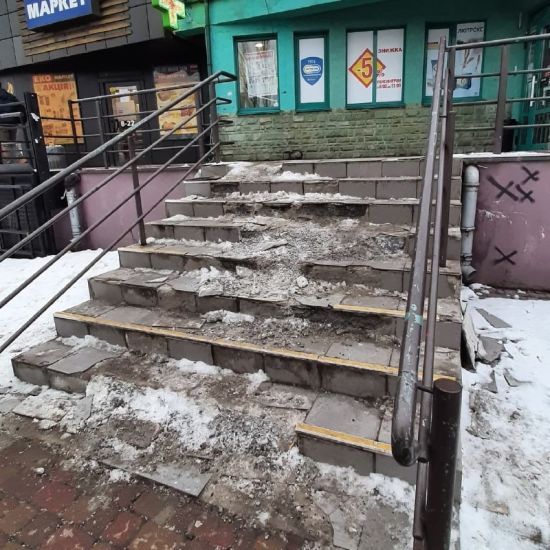Эти опасные ступеньки расположены на улице Ивана Миколайчука, 11, возле супермаркета и аптеки.