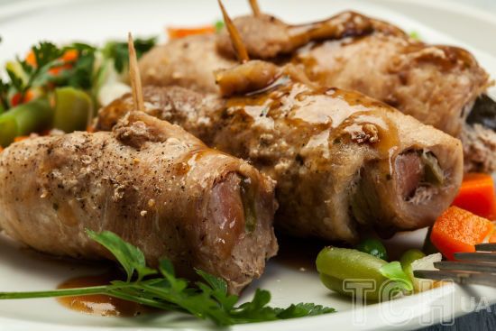 Такие рулетики станут украшением не только семейного ужина, но и праздничного стола. Для этого блюда возьмите мякоть свинины, а для начинки картофель и маринованные огурцы. Скрутите в рулетики и запеките в духовке. Они хороши будут не только горячими, но и холодными.